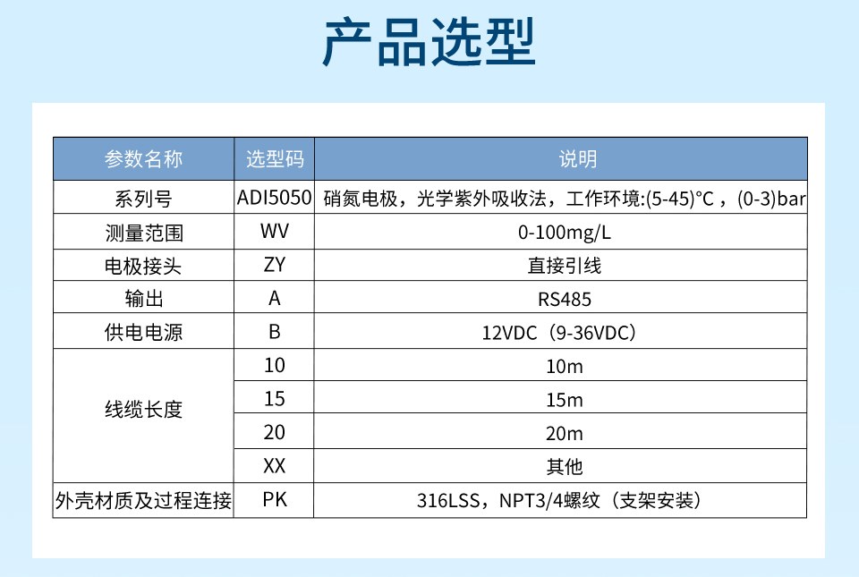 產品描述:ADI5050款硝氮電極是基于紫外光吸收法測量,一種利用紫外光譜分析技術,直接、快速、準確地測量水體中硝態氮(NO?-N)濃度的先進在線監測設備。通過校正公式消除有機物干擾,最終根據朗伯-比爾定律將計算出的凈吸光度值實時轉換為硝酸鹽氮(NO3-N)的濃度值,并通過數字信號輸出。