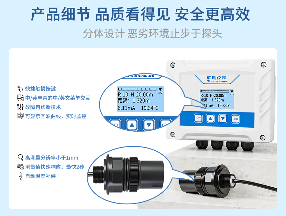 產品名稱:超聲波液位計(測量液位/物位),是一種非接觸式、高可靠性、高性價比、易安裝維護的液位/物位測量儀器